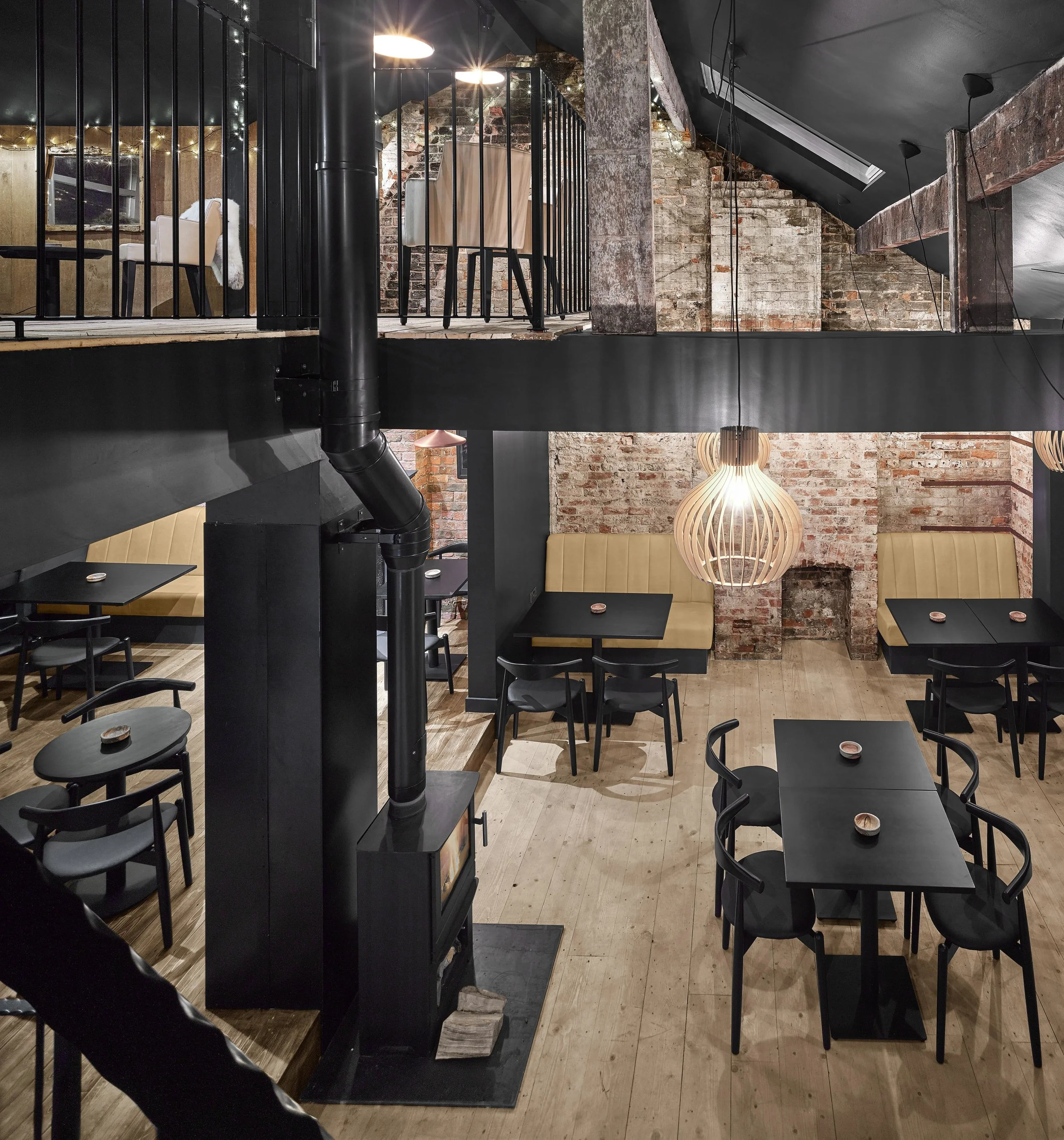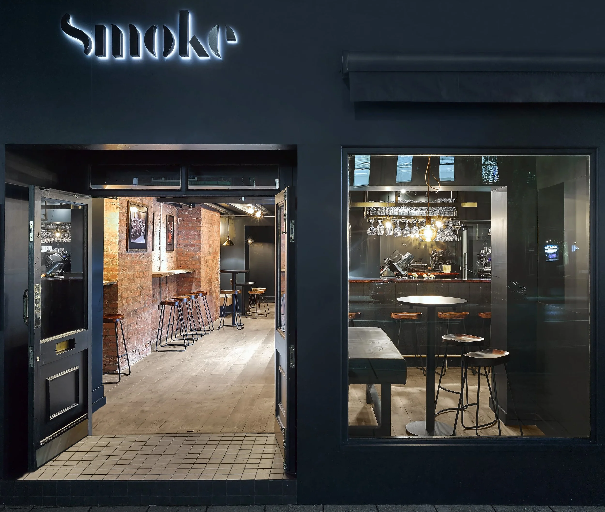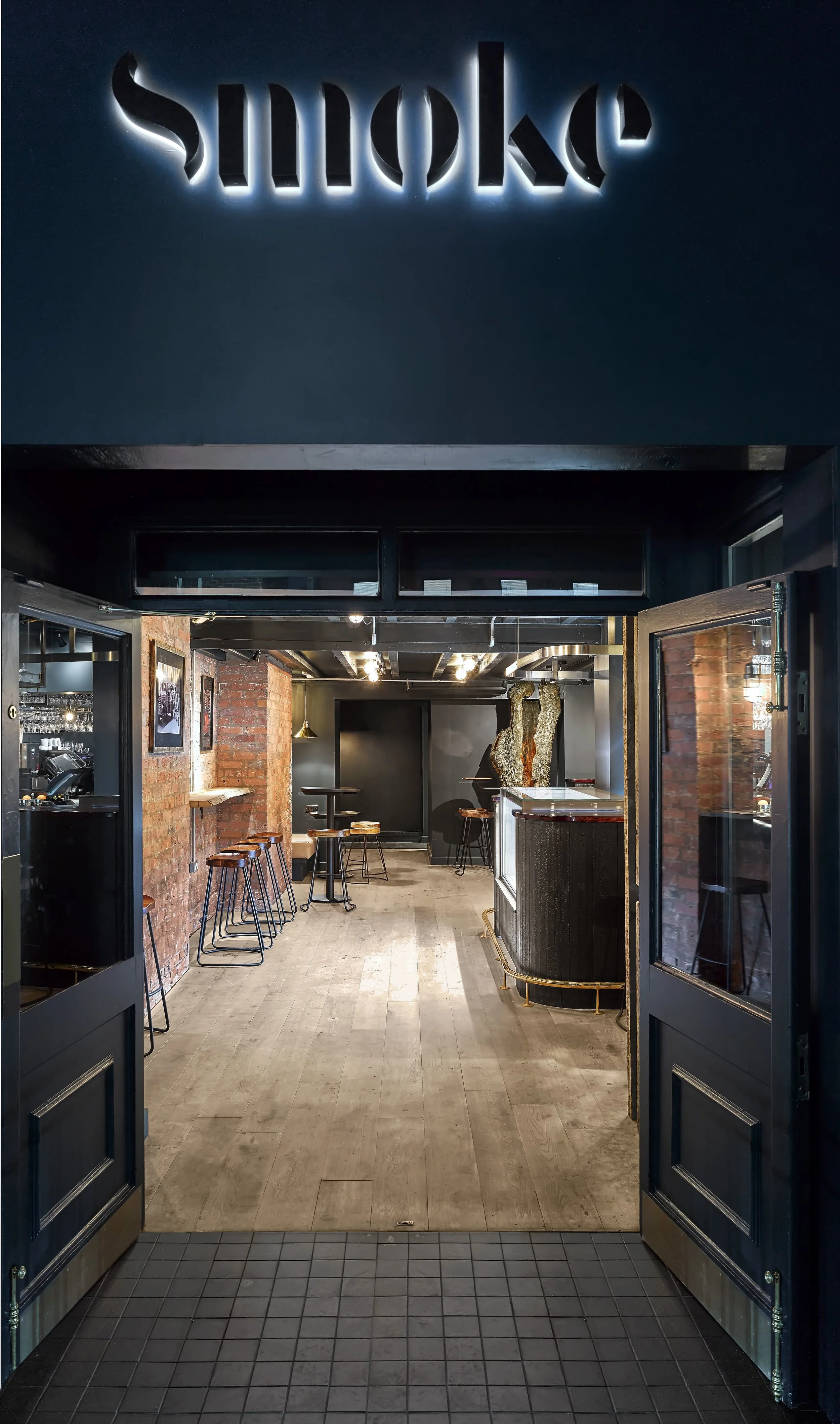 Smoke bar represents a new business direction and ambition for the long established family run business. New wood-burning stoves, a charred Accoya bar, double height dining rooms and even a 100 year old burnt out ash tree, create a unique and engaging setting of darkened interiors and warm lighting.