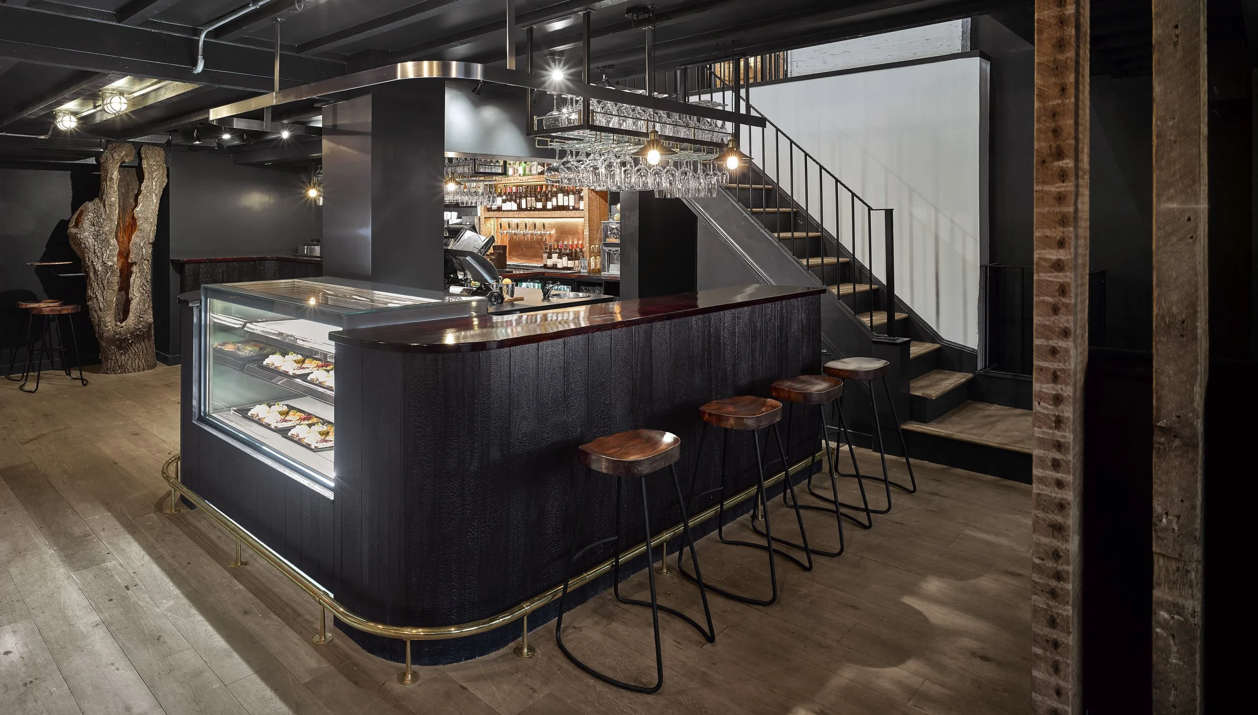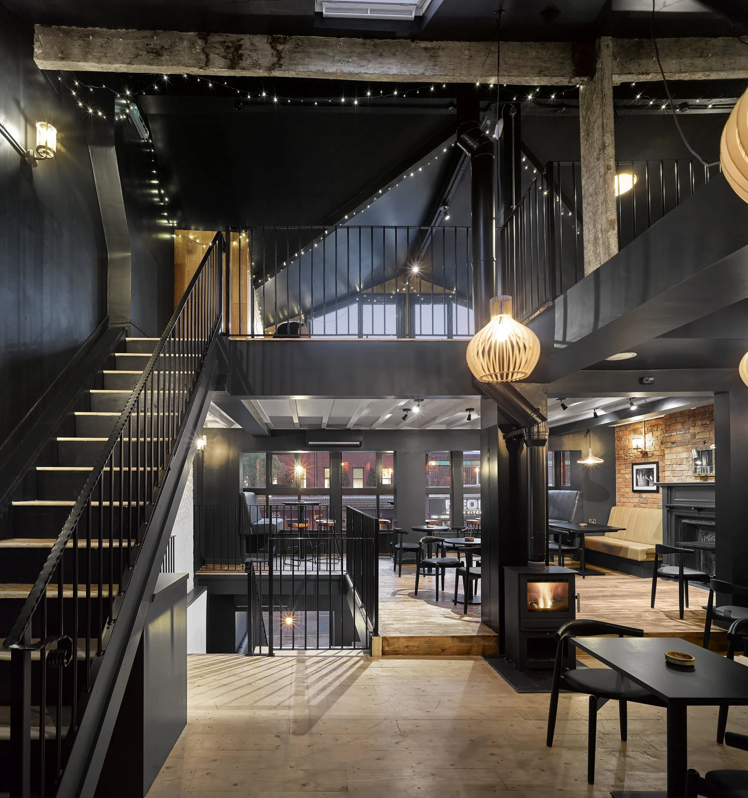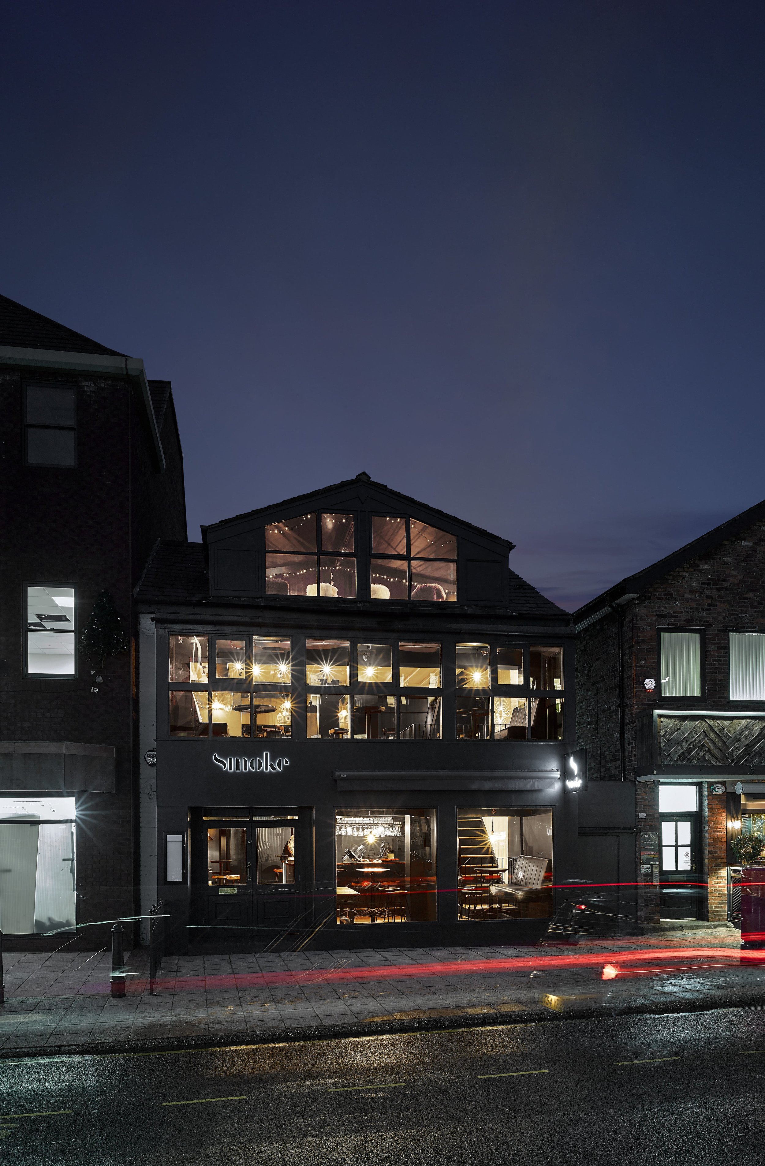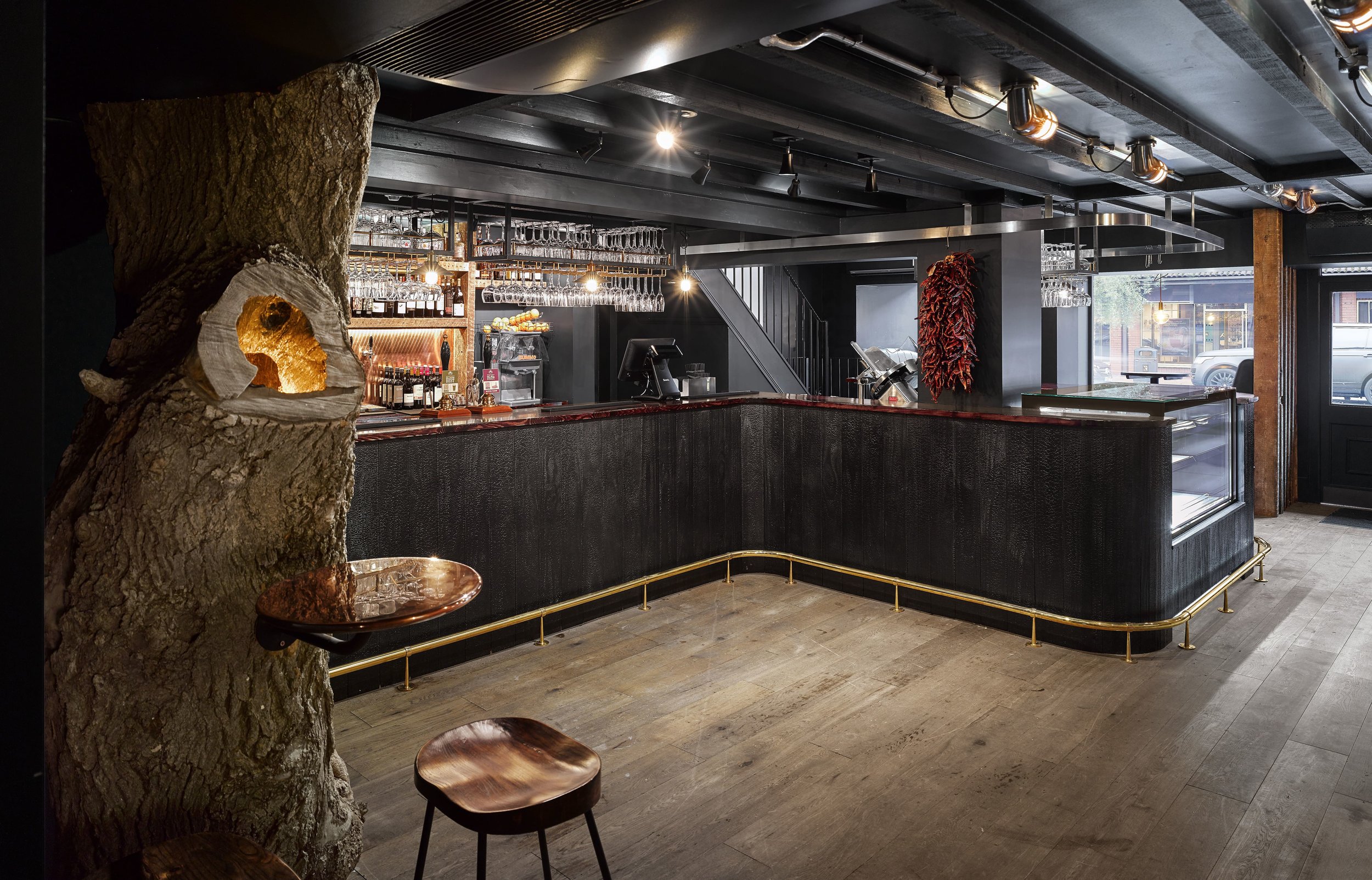 Smoke bar represents a new business direction and ambition for the long established family run business. New wood-burning stoves, a charred Accoya bar, double height dining rooms and even a 100 year old burnt out ash tree, create a unique and engaging setting of darkened interiors and warm lighting.